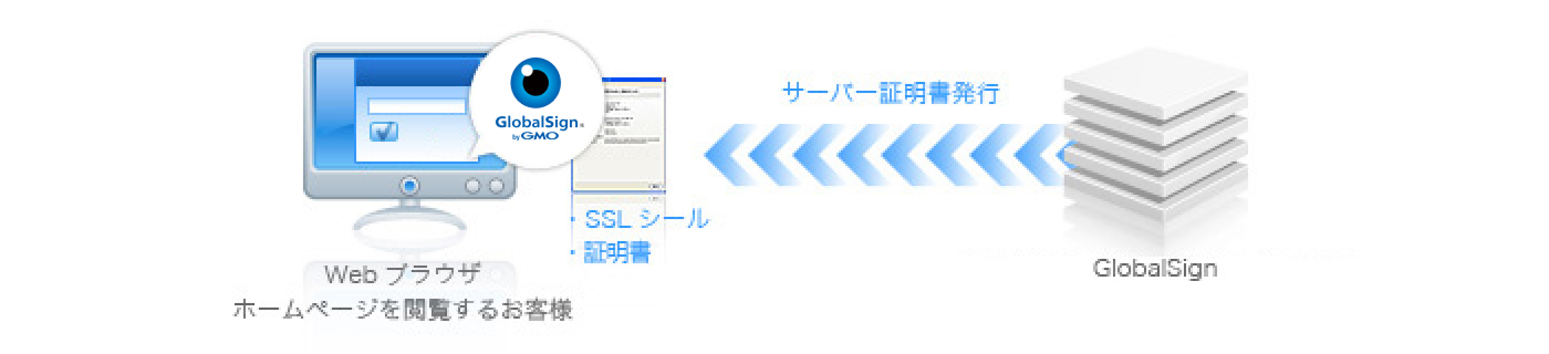 SSLサーバー証明書は、「インターネット上のホームページが、実在する企業・組織によって運営され、確実に存在していること」を証明する、実在証明書(SSLサーバー証明書)を発行するサービスです。